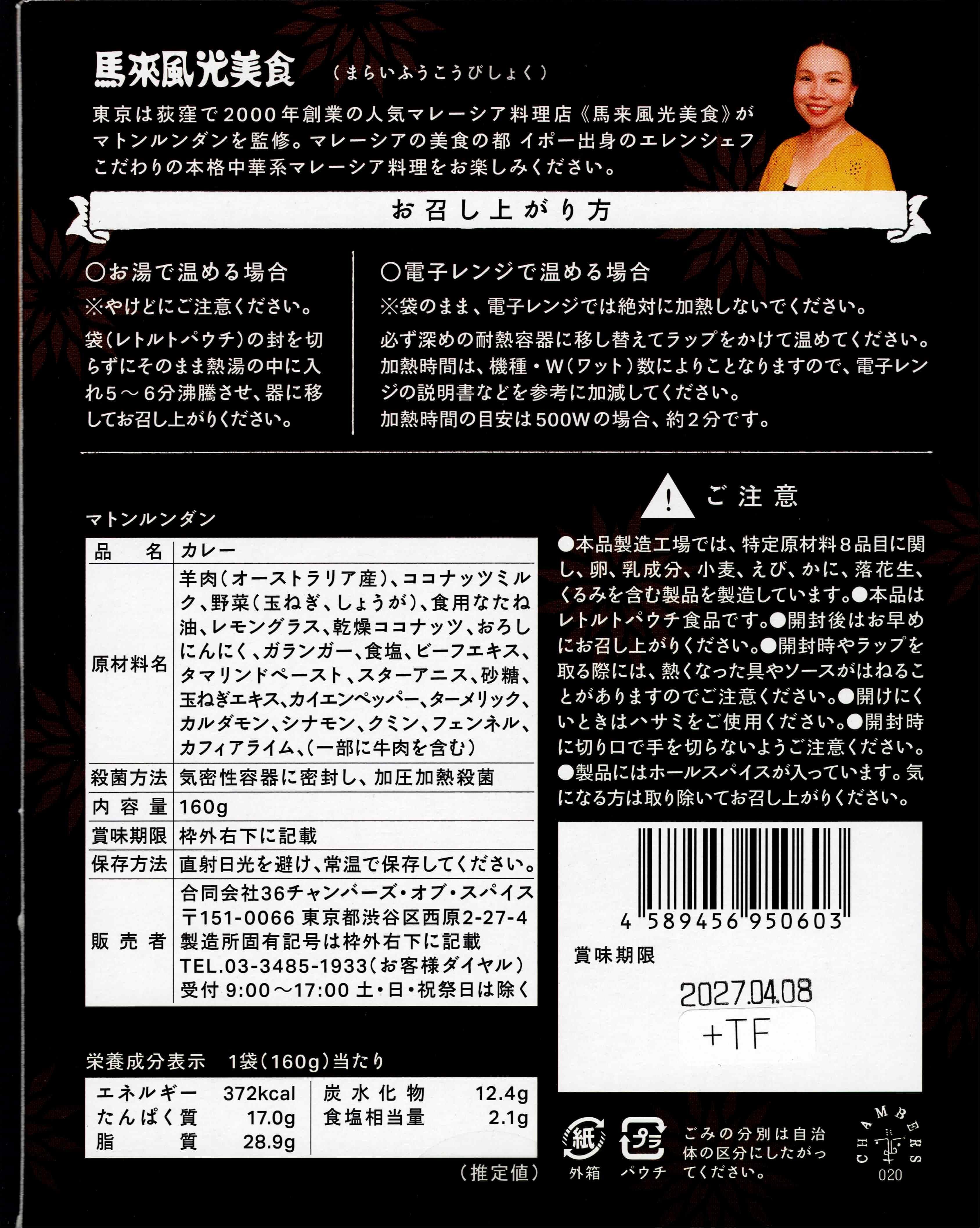 東京都荻窪のマレーシア料理店「馬来風光美食」のオーナーシェフ、エレンさん監修のマレーシアカレー ルンダン。スパイス、ハーブ、ココナッツファインがタップリ入った風味豊かでまろやかなコクにハマります。36cosオリジナル商品第三弾!